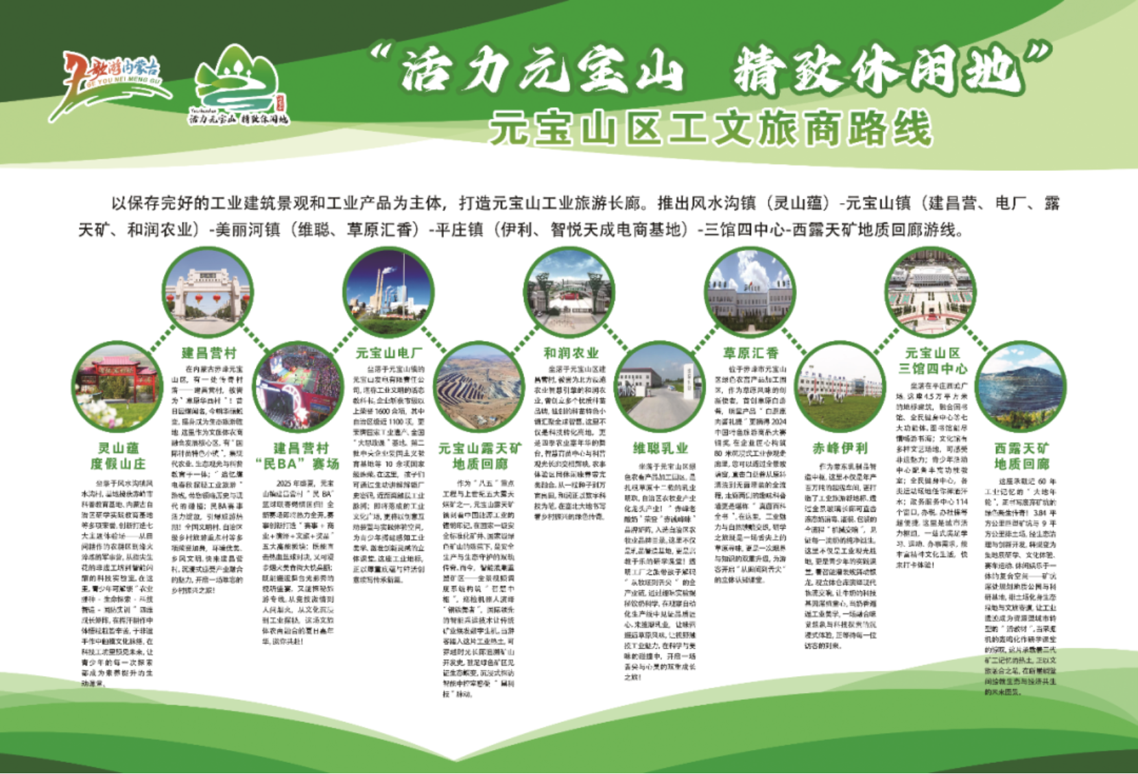 始终把顶层设计作为融合发展的首要任务,先后编制实施《全域旅游总体规划》《“十四五”文化和旅游发展规划》,2023 年特邀专业机构编制《文旅赋能绿色转型示范区建设方案(初稿)》,明确“工业 + 文旅 + 农业 + 研学 + 城市建设”三步走发展战略,为融合发展划定清晰路线图、提供坚实政策支撑。同步系统开展元宝山电厂、露天煤矿等工业遗产资源普查,深度挖掘其科技价值、文化内涵与研学功能,依托元宝山发电厂全国“大思政课”实践教学基地、国家工业遗产展馆等核心载体,推动静态工业遗存转化为鲜活文化教育载体,持续激活“工文旅”融合发展的内生动力。