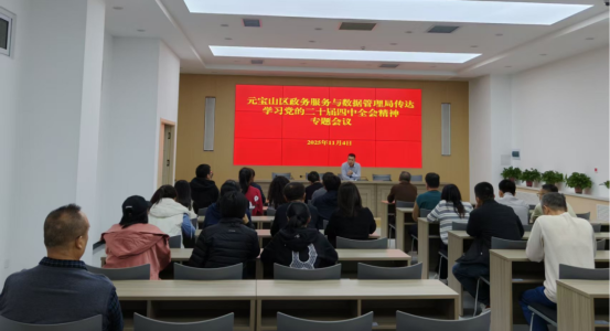 近日,元宝山区政务服务与数据管理局组织召开学习贯彻党的二十届四中全会精神专题会议,重点学习了《中国共产党第二十届中央委员会第四次全体会议公报》等内容,同时结合单位实际,对抓好宣传贯彻全会精神工作进行部署动员。