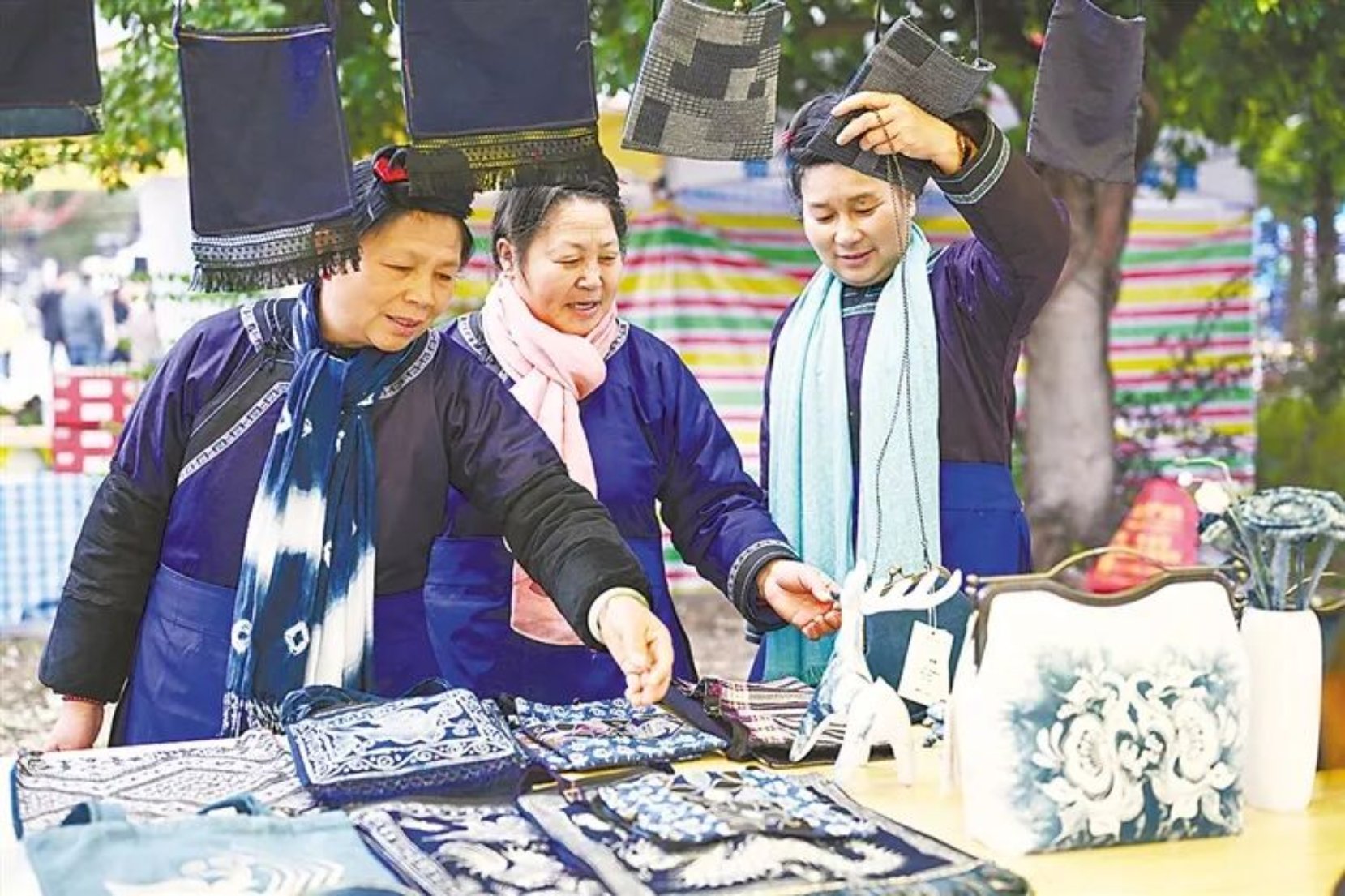 ▲自“村超”赛事走红以来,榕江县积极开办流动“村超村集”,吸引众多游客和居民前往赶集。图为村民在榕江县忠诚镇“村超村集”选购文创产品。 新华社记者 杨文斌摄