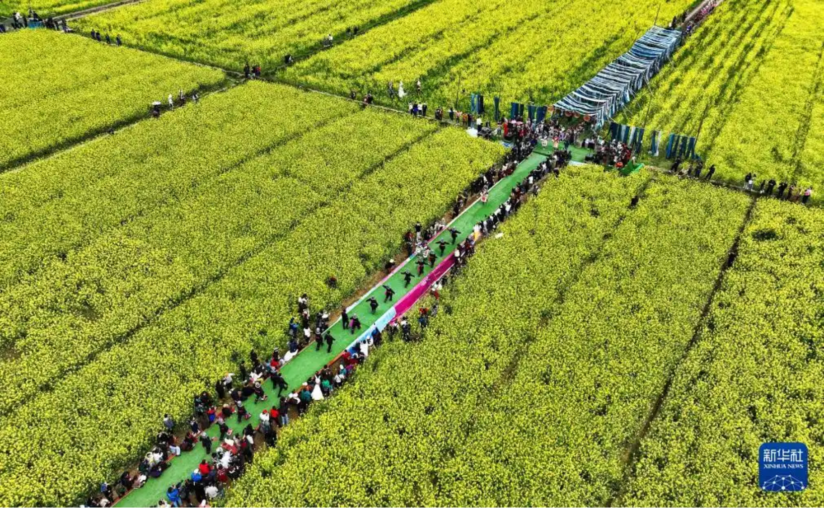 ▲在贵州省榕江县车江大坝,游客在观看民族盛装花田走秀(2025年3月16日摄,无人机照片)。新华社记者 杨文斌 摄