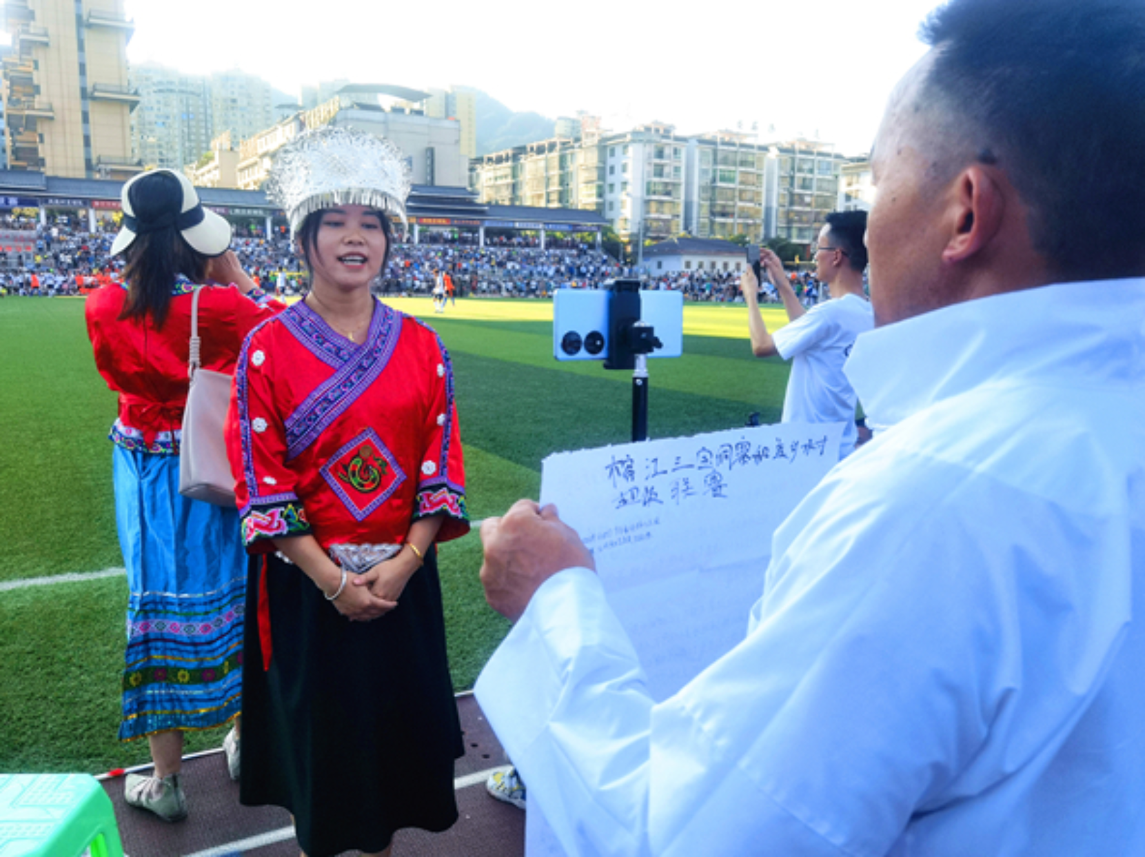 ▲“乡村主播”沈芝琴在“村超”现场直播球赛。 来源:贵州省榕江县人社局