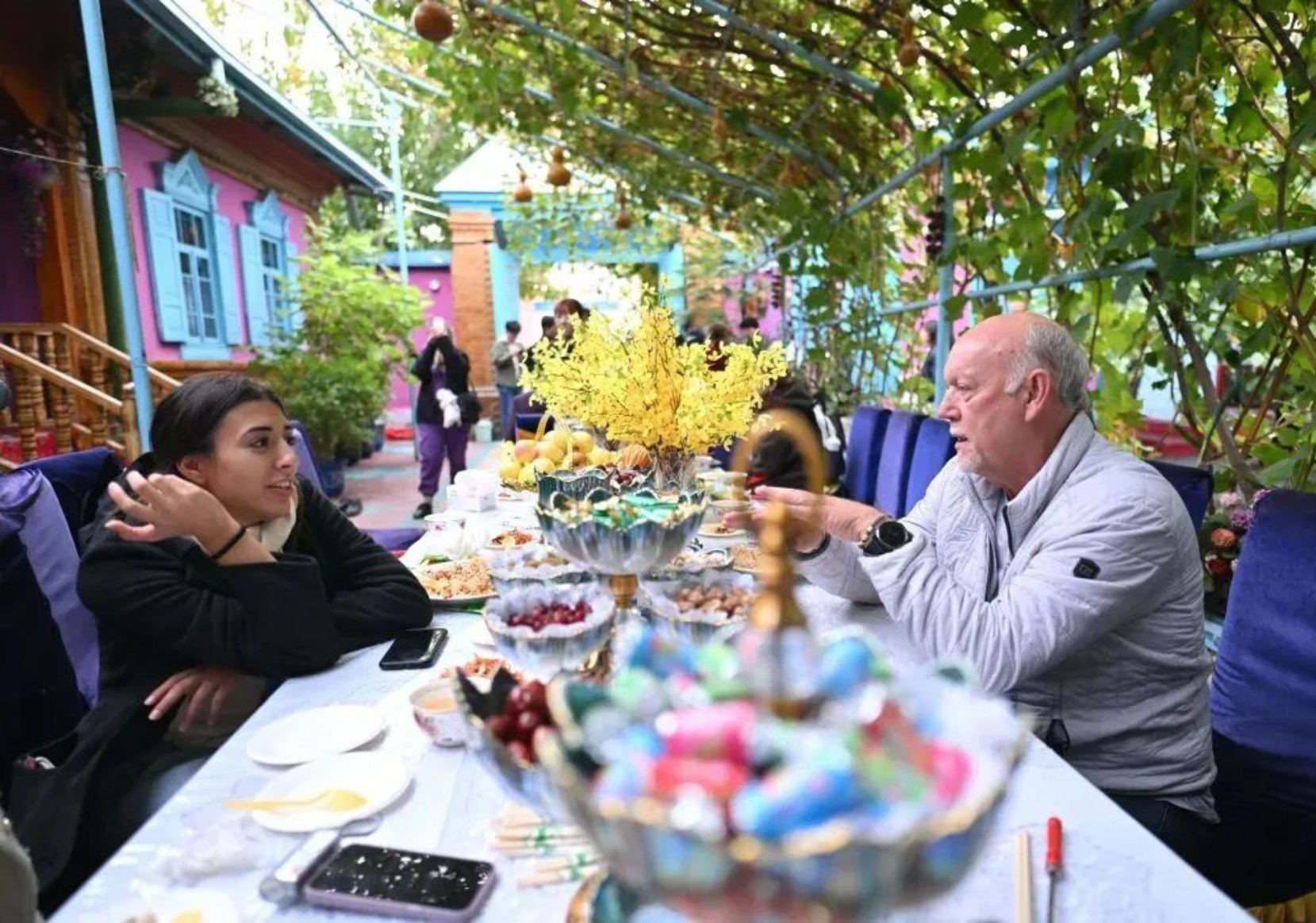 ▲2024年10月15日,外国嘉宾在新疆伊宁市喀赞其民俗旅游区参访。新华社记者 李响 摄