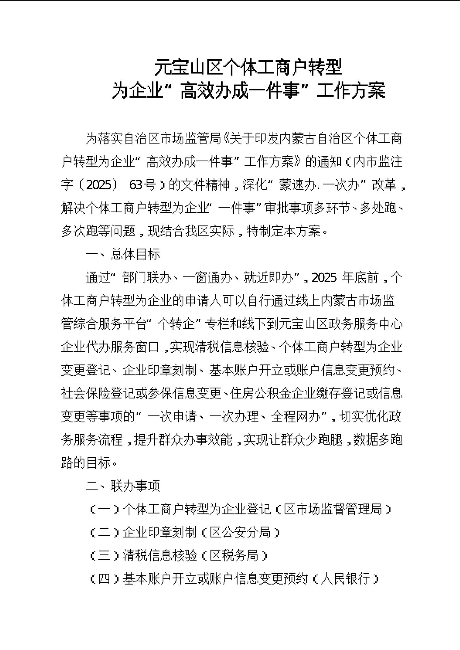 关于印发《元宝山区个体工商户转型为企业“高效办成一件事”工作实施方案》的通知