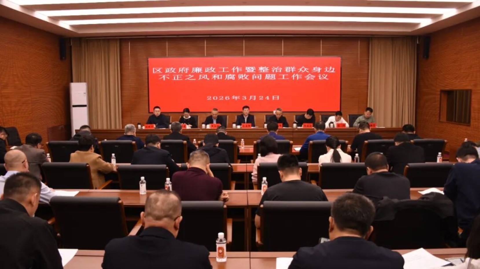 3月24日,区委副书记、区政府区长孟庆辉主持召开区政府廉政工作暨整治群众身边不正之风和腐败问题工作会议,区委常委、纪委书记、监委主任刘海洋应邀出席会议,传达学习了刘金国同志在群众身边不正之风和腐败问题集中整治总结表彰暨2026年动员部署会上的讲话精神;区民政局、农牧局、医保局、平庄镇围绕党风廉政和整治群众身边不正之风和腐败问题工作依次进行表态发言。