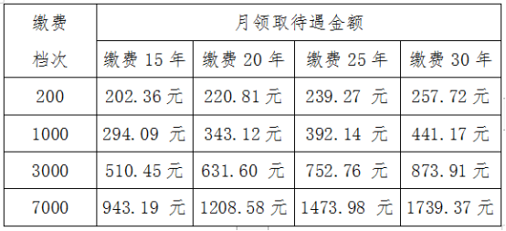 下面仅以按年缴费200元,1000元,3000元,7000元四个缴费档次,分别缴纳15年、20年、25年、30年例举领取待遇金额。