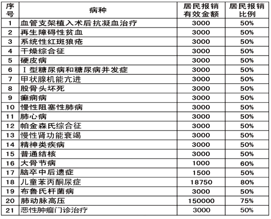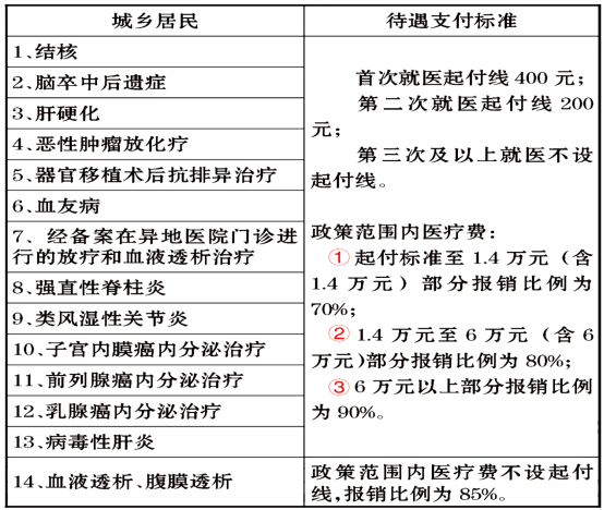 (三)居民“两病”用药。“两病”是指高血压和糖尿病。高血压门诊用药,政策范围内支付比例为50%,年度最高实际支付300元;糖尿病门诊用药,政策范围内支付比例为50%,年度最高实际支付600元;“两病”并发的门诊用药,政策范围内支付比例为50%,年度最高实际支付600元。可以在一级、二级定点医院申请,不可以在三级医院申请。
