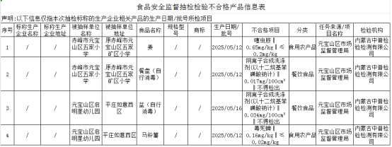 近期,元宝山区市场监督管理局组织开展了2025年食品安全监督抽检(第二期)。截至目前,共抽取了201批次样品,其中合格样品197批次,不合格样品4批次,合格率为98%。合格与不合格信息仅指本次抽检标称的生产企业相关产品的生产日期/批号和所检项目。