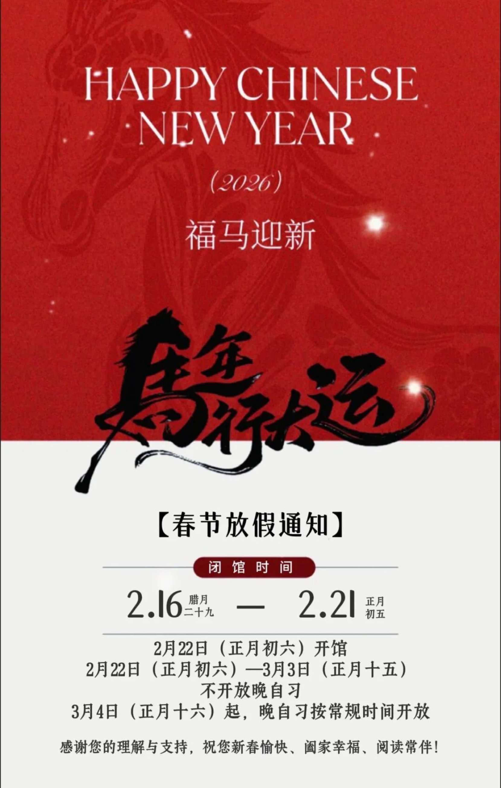 为使广大读者度过祥和的新春佳节,结合国务院春节放假安排及我馆实际工作情况,现将 2026 年春节期间开放事宜通知如下: