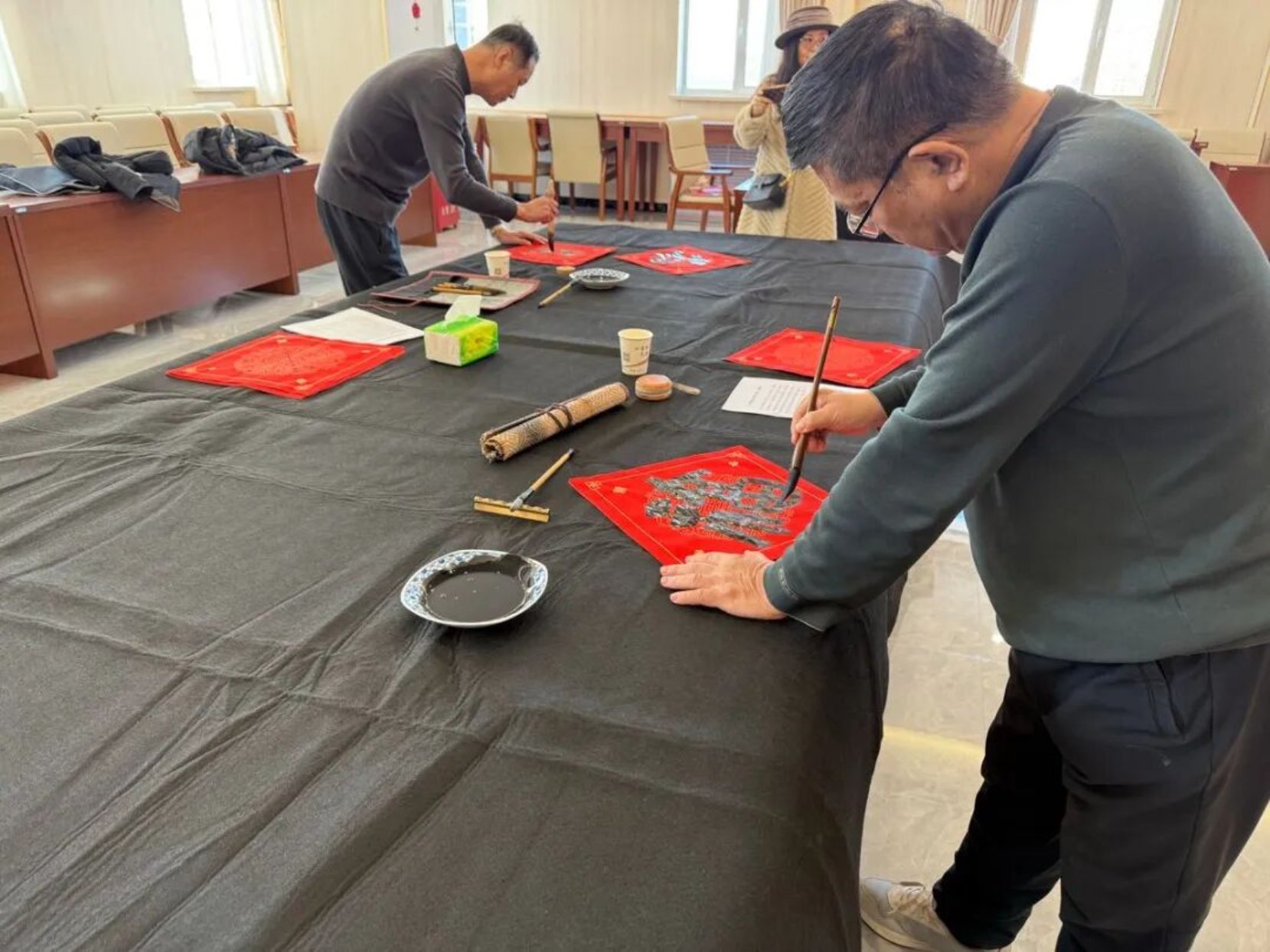 活动现场,来自元宝山区书法家协会的书法名家们精神饱满、挥毫泼墨,一笔一画间尽显书法艺术的博大精深。楷书端庄秀丽,行书流畅洒脱,隶书古朴典雅,一幅幅寓意吉祥、饱含深情的春联,一个个圆润饱满、喜气洋洋的“福”字,在名家笔下应运而生,字里行间既有对新春的美好期盼,也有对传统文化的深情诠释。墨香袅袅中,书法名家们不顾辛劳,耐心询问读者的需求,无论是经典祈福春联,还是个性化定制内容,都一一悉心书写,用笔墨传递着新春的温暖与文化的力量。