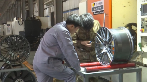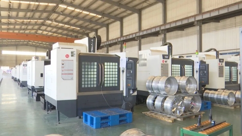 与慕帆能源科技施工现场的繁忙景象相呼应,赤峰中秦铝业有限公司的生产车间里同样是一片火热的生产场景:在宽敞明亮的现代化厂房内,生产线高速运转,经过切削、精加工、表面处理等多道工序,一组组银光闪闪的铝合金轮毂源源不断地走下生产线。
