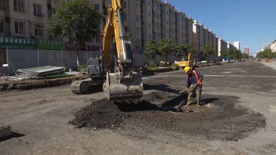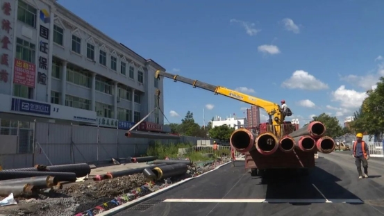 赤峰市金川市政建设工程有限公司技术员王新伟:“银河街管网工程全长1450米,拆除原有排水管道,路面加宽至18米,新建雨水、污水、给水、热力管道,现雨水工程已全部完成,污水、给水、热力管道工程即将完成,宝山路至政府门前路段路面工程已完成,目前全线正在进行道路工程施工,预计9月末全线通车。”