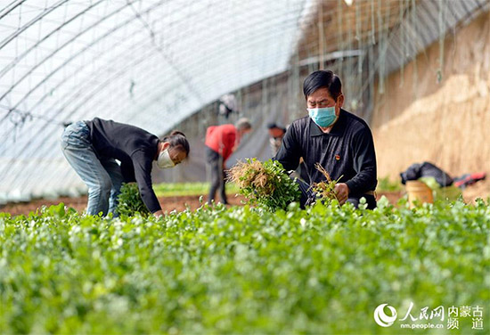 内蒙古呼和浩特市赛罕区黄合少镇组织313名共产党员对24个村庄中的240户菜农实施党员包户工作,图为党员王福俊(右)帮助菜农收获蔬菜。王正 摄