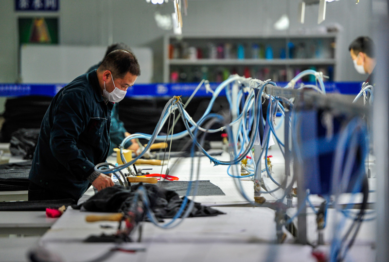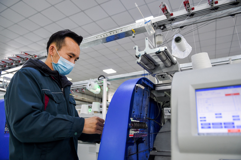 3月6日,工人在内蒙古德昇绒毛制品有限责任公司的生产车间查看设备运行情况。