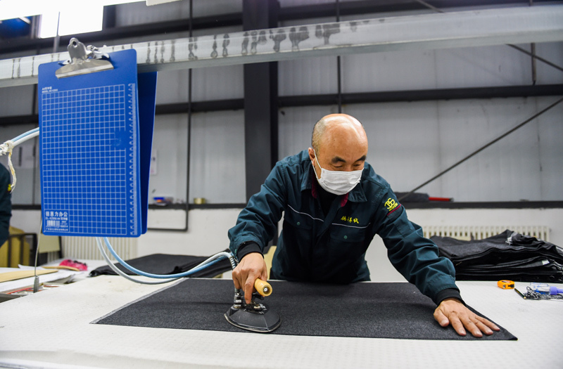 3月6日,工人在内蒙古德昇绒毛制品有限责任公司生产车间熨烫围巾。