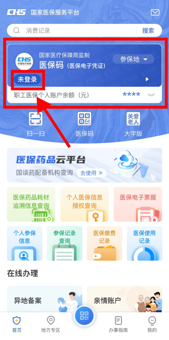 1.打开国家医保服务平台APP,若是显示未登录,点击未登录登录即可登录(如果是首次登录,点击立即注册),若是已登录,忽略此步骤: